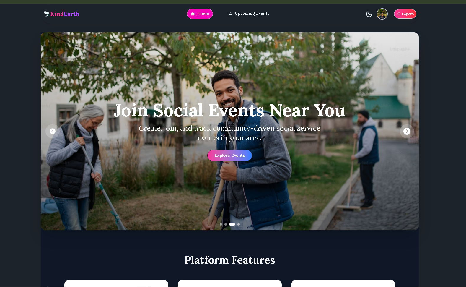 KindEarth - is a community-driven event management platform that empowers users to create, join, and manage social service events in their local area.From cleanup drives and plantation programs to donation campaigns — KindEarth brings people together to make a positive impact on society