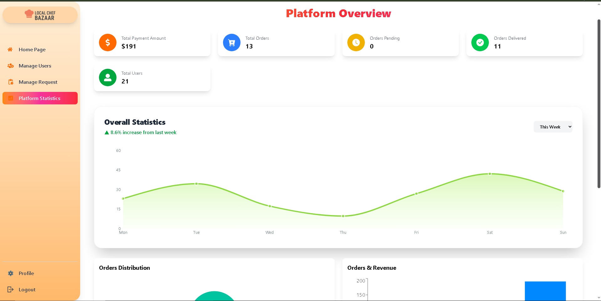 LocalChefBazaar is a modern online platform connecting home cooks with customers seeking fresh, homemade meals. Customers can browse meals, place orders, leave reviews, and manage favorites, while chefs can upload menus and handle orders. Admins manage users, requests, and platform statistics.